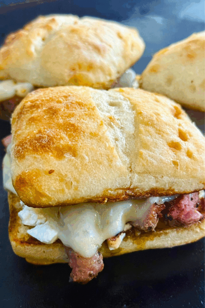 Slice and serve Blackstone Pesto Goat Cheese Steak Sandwiches right away, and with lots of napkins 😉